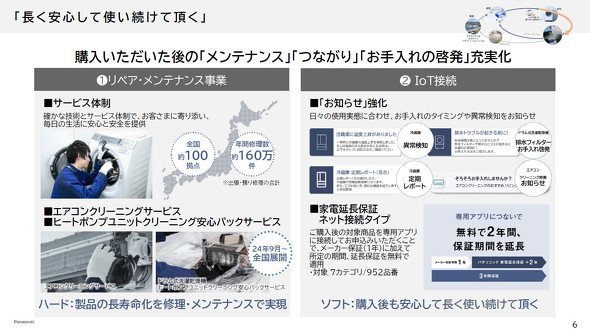 長く安心して使い続けていただくでは、国内約100拠点でリペア/メンテナンス事業を行い、修理件数は年間160万件に上る。従来のエアコンクリーニングに加え、2024年9月からドラム式洗濯乾燥機のヒートポンプユニットのクリーニングも全国展開している。パナソニック マーケティング ジャパン ダイレクト事業戦略室 新規事業推進部 部長の渡邊暦氏は「購入後もリペア/メンテナンスによる製品の長寿命化を図り、購入後も安心して使い続けていただく取り組みを進めている」と話す。
