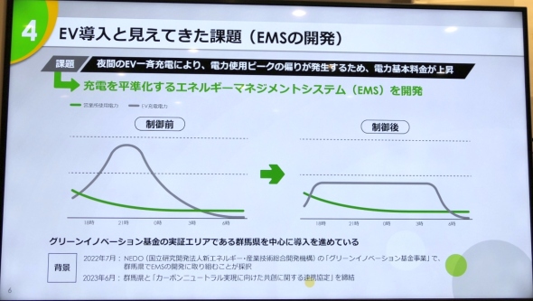 1点目は、夜間のEV一斉充電による電力コストの上昇である。例えば、1カ所の集配拠点で扱う数十台のEVの配送車両が同時に充電を開始してしまうと、電力基本料金の基準となるピーク電力が極めて高くなってしまい、拠点の年間の電力料金が数百万円上がってしまう。そこで、夜間のEVへの充電を平準化するEMS(エネルギーマネジメントシステム)を開発し、ピーク電力を約半分に抑えられるようにした。現在、グリーンイノベーション基金の実証エリアである群馬県を中心に導入を進めているところだ。