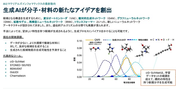 ニューラルネットワークアーキテクチャを扱えるツールには、データセットが少なくても、大規模で複雑な材料に対して良好な候補を生成するとともに、生成された候補物質の合成可能性を予測できるものもある。こういったツールで代表的なものとしては、「cG-SchNet」「STONED-SELFIES」「REINVENT」「GaUDI」「Chemeleon」がある。
