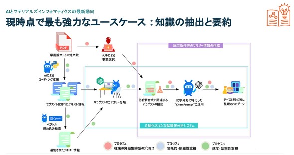 「知識の抽出と要約」は研究開発におけるLLMのユースケースで最も多い。「LLMは人間の言語を模倣するように設計/最適化されているため、言語ベースのタスクで非常に高いパフォーマンスを発揮する。幾つかのLLMツールでは、公開されている研究文書から重要な情報を抽出しそれを要約してユーザーに提示でき、資料を調べる時間を減らせる。最近のLLMツールでは、情報を抽出した文書にリンクを搭載でき、結論の裏付けを確認したり、具体的な情報を読み込めたりする。一般的な化学の質問や問題に関しては、現状最良のLLMは、典型的な修士レベルの化学者と同等のパフォーマンスを発揮しており、特に言語ベースの化学的な問いに強い。しかし、LLMは依然として論理的/数学的な処理を多く必要とする問題には苦戦することがよくある」(ハイバー氏)。
