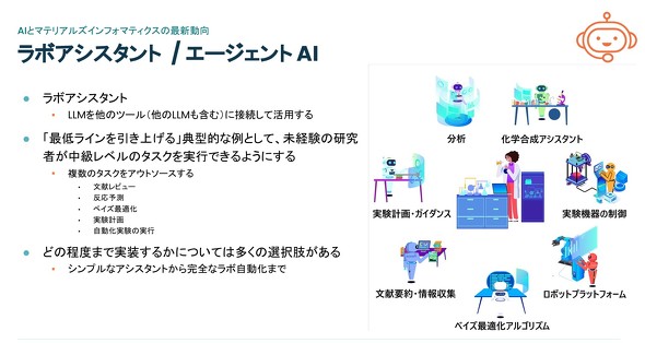 こういったLLMの課題を解消するのが、LLMを他のツール(他のLLMも含む)に接続して活用するラボアシスタントやLLMエージェントだ。ハイバー氏は「LLMに、多数の計算やシミュレーション、専門的な処理が求められる場合に他の『エージェント(代理システム)』に処理させるのがLLMエージェントとなる。こうした『エージェント型AIシステム』は、多様なタスクを実行するように設計/最適化でき、完全自律的に動作することもある。自然言語インタフェースも備えているため、初心者の研究者でも簡単に使える」という。