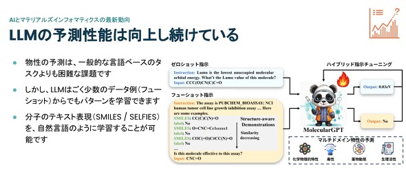 また、LLMを用いた物性の予測は、一般的な言語ベースのタスクよりも困難だが、少数のデータ例(フューショット)からパターンを学習できる。「LLMは基盤モデルとして持つ事前学習の能力を活用し、少しの問題例やデータセットからでも素早くパターンを学び、良好な物性予測を行える可能性がある。この能力は既に言語分野では高く評価されているが、最近ではこれを物性の数値予測、つまり言語以外の予測に応用しようという取り組みも進んでいる。物性の予測に優れた機械学習モデルや従来型のディープラーニングモデルも存在する。これらは大量のデータを必要とするが、LLMは『化学の言語』を学ぶことで、わずかなデータしかない場合でも、ある程度正確な予測が行えるようになるかもしれない」(ハイバー氏)。