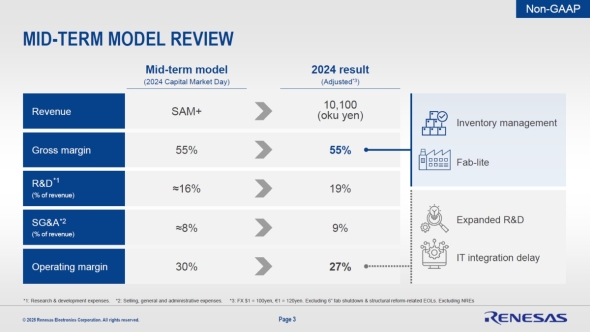 2024年のルネサスの連結業績では、売上高が2年連続で減少しているものの売上高利益率は55%で事業モデルの目標を維持している。これは在庫調整とファブライト戦略の推進によるところが大きい。その一方で、研究開発費率(R&D)が事業モデルの16%から19%に高止まりしており、営業利益率が27%と事業モデルの30%を下回る原因になっていた。