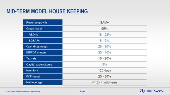 新たな事業モデルでは、営業利益率目標を25〜30%と幅を持たせることによって、柴田氏が述べた通り研究開発に投資する余地が生まれる。研究開発費率は従来の16%に対して18〜22%に積み増す。なお、ルネサスはEV(電気自動車)向けを中心に製品開発を進めてきたSiC(シリコンカーバイド)デバイスやIGBTなどのパワー半導体の事業展開を延期する方針を明らかにしている。これによって工場への投資が抑えられているため、研究開発費にリソースを投入する余地が生まれている。