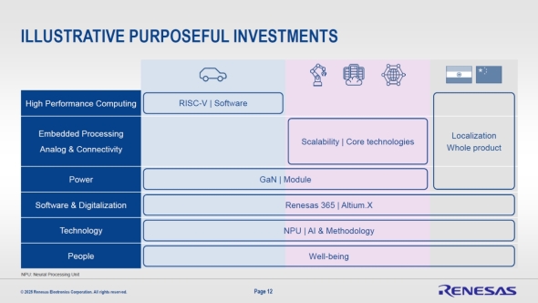 柴田氏は、付け焼刃ではない本腰を入れて研究開発を進める対象として、車載ではRISC-Vとソフトウェア、パワー半導体ではGaN(窒化ガリウム)とモジュール、先述したRenesas 365とアルティウムなどを挙げた。「AI(人工知能)などに関するR&DのRの部分についても、時間軸を長めに設定して手厚く配分する。半導体設計のメソドロジーについてもAIの力を活用したモダンなものに変えていく」(柴田氏)という。