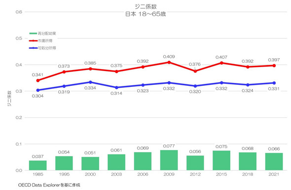 再分配効果も1985年から見るとやや上昇しています。これは以前と比較して、格差是正の効果が強まっていることを示しています