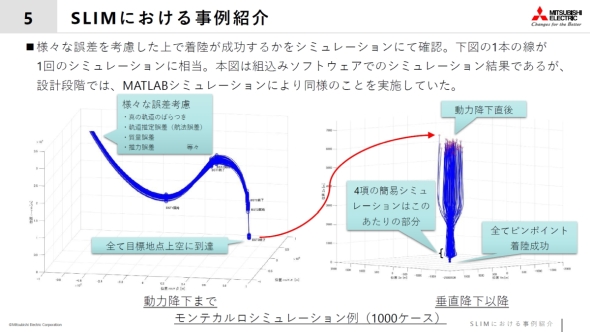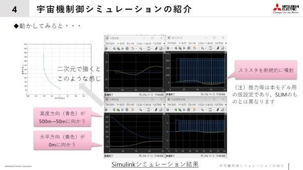 SLIMに関しては、設計/検討の初期段階からMATLABを利用したシミュレーションに基づき機体の開発を進めたという。また、開発途中からはSLIMに実際に組み込んでいるソフトウェアを用いたが、シミュレーション結果を自動的にグラフ化するなどの効率化する用途でMATLABが大いに役立った。