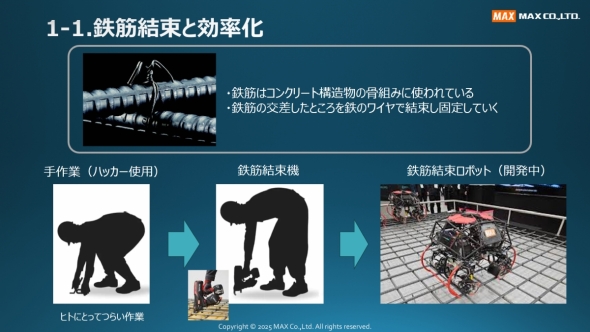 マックスは現在、この鉄筋結束作業を自動化すべく、鉄筋結束ロボットの開発に挑戦している。鉄筋結束の作業は、結束機を使っても腰をかがめる姿勢を強いられる。これをロボットに置き換えられれば、働き手を苦しい姿勢から解放し、工事の工程も効率化できる。