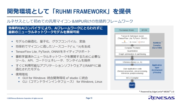RA8P1の発売に合わせて、ルネサスとして初となるマイコン/MPU向けの包括的なAI開発用フレームワーク「RUHMI(Renesas Unified Heterogenous Model Integration、ルミ)」の提供を開始する。EdegCortixの「MERA 2.0」を採用したAIコンパイラにより、マイコンとMPUに最適な形でAIモデルを実装することが可能になる。マイコン向けでは統合開発環境「e2studio」のプラグインとして、MPU向けではWindowsやLinux向けのCLI(コマンドラインインタフェース)として提供される予定だ。今後投入されるルネサス製品のAI開発用フレームワークはRUHMIに統一されることになる。