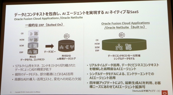 ERPなどの基幹システムにおいてAI活用が叫ばれているが、現状ではシステムから得られるデータは外付けのAI専用データストアに蓄積されるだけになっている。「これではリアルタイム性を欠くし、データと併せて必要になるコンテキストから切り離されてしまっている」(三澤氏)。これに対して、オラクルのクラウドベースの基幹システムスイートである、大企業向けの「Oracle Fusion Cloud Applications」や中堅中小企業向けの「Oracle NetSuite」は、データとコンテキストを一元管理するシングルデータモデルを用いており、このことがリアルタイムかつ高精度なAIエージェントを実現する原動力になっている。
