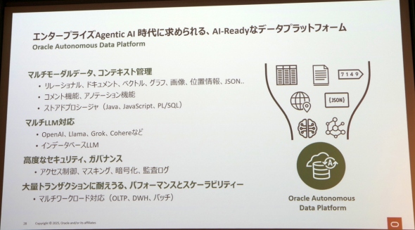 このシングルデータモデルに基づくAI-Readyなデータプラットフォームとして構築しているのが「Oracle Autonomous Data Platform」である。三澤氏は「AIという観点ではコンテキスト管理と併せてマルチモーダルデータへの対応も重要だ。また、AIエージェントは大量のトランザクションを生み出し、データベースにわがままなほどの要求をしてくる。この大量トランザクションにスケーラブルに対応できるのは、データベースシステムのベンダーであるオラクルだけだ」と述べる。