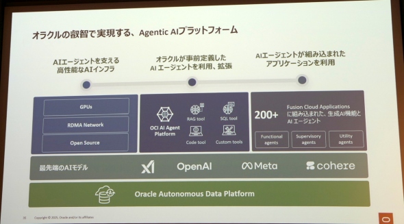 GPUを用いたAI基盤として高い評価を得るOCI、Oracle Fusion Cloud ApplicationsやOracle NetSuiteに組み込まれたAIエージェント機能、AI-ReadyなデータプラットフォームであるOracle Autonomous Data Platformに、最先端のAIモデルを組み合わせることで、オラクルはAIエージェントプラットフォームとして大きな強みを持つことになる。三澤氏は「AIがオラクルを再発見し、再発明してくれた」と述べており、今後もAIによってオラクルのソリューションを強化していく方針を示した。