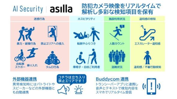 アジラのAI Security asillaは、警備員の負担を軽減し、迅速かつ正確な対応を可能にするため、24時間365日AIが映像を監視する。既存の防犯カメラ映像をAIが解析し、転倒などの異常行動や徘徊などの注意行動をリアルタイムで検知する。