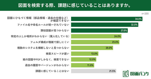 「図面検索時に感じている課題」では、「図面にひもづく情報が確認できない」が34.0%と最も多く、「ファイル名や命名ルールが統一されていない」が32.0%、「類似図面が見つからない」が27.0%だった。