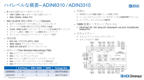 ADIN6310は6つ、ADIN3310は3つのイーサネットポートをサポート可能。通信速度は10M/100M/1Gbpsに対応しており、各ポートはそれぞれ異なる速度で動作するように設定できる。未割り当てのメディアアクセス制御(MAC)インタフェースを備え、ADIN1100、ADIN1200、ADIN1300など同社の物理(PHY)レイヤーデバイスと組み合わせることで、低消費電力、低遅延のシステムを構築できる。ADIN6310は2024年末に、ADIN3310は2025年初に量産がスタートしたという。