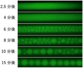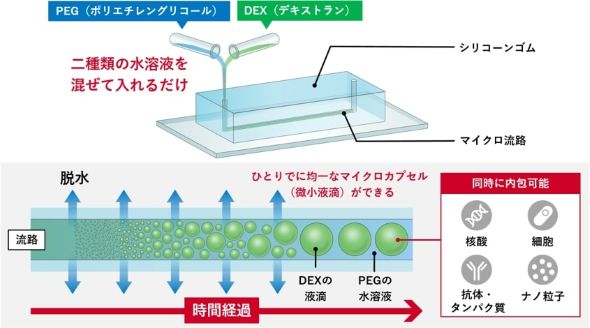 この性質に注目し、ポリエチレングリコール(PEG)とデキストラン(DEX)の2種類の水溶液を混合した。この混合水溶液を20μm幅のマイクロ流路に導入すると、水分がPDMS製の流路壁中をゆっくり通り抜け、流路内でPEGとDEXの濃度が高まる。その結果、油と水のように分離する水−水相分離が生じ、DEXを主成分とするマイクロカプセルが自然と形成される。
