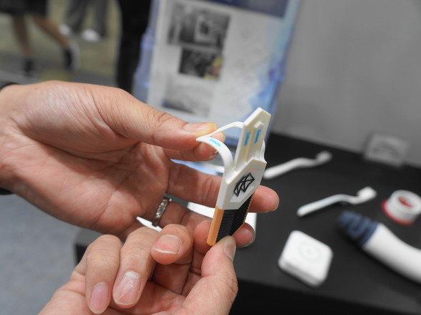 丸紅情報システムズの説明員は「PolyJet ToughtONE 樹脂は、高い靭性と強度を両立している点が最大の特徴だ。この製品は、従来品が抱えていた『負荷がかかると割れやすい』という課題を克服している。そのため、部品同士を接着剤やネジを使用せずに、材料の弾性を利用してはめ込むことで固定するスナップフィット構造などの検証に適している。加えて、耐熱性の高い材料と組み合わせて3Dプリントすることで、より強度と耐熱性を高めた部品を一体成形することも可能だ」と語った。