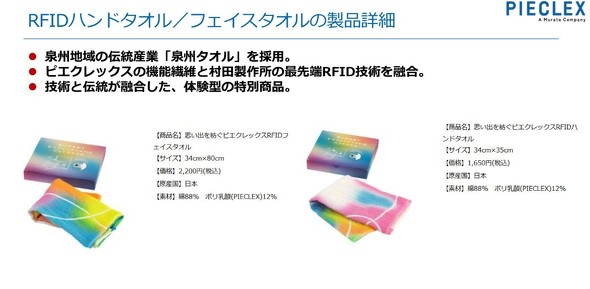 思い出を紡ぐピエクレックスRFIDハンドタオル/フェイスタオルは、「2025年日本国際博覧会(大阪・関西万博)」(会期:2025年4月13日〜10月13日)で販売されている。両製品は、2025年大阪・関西万博に設置されているパビリオン「Better Co-Being」の世界観をモチーフに開発されたもので、綿やPIECLEX、村田製作所が開発したRFIDマイクロタグなどで構成される。