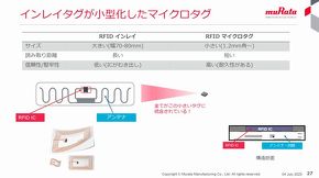 RFIDマイクロタグは、村田製作所が培ってきた積層技術などを活用して、RFIDインレイタグを小型化した製品だ。同製品は、RFIDインレイタグと比べて、サイズが1.2mm角〜と小さく、読み取り距離が短くて、耐久性が高い。