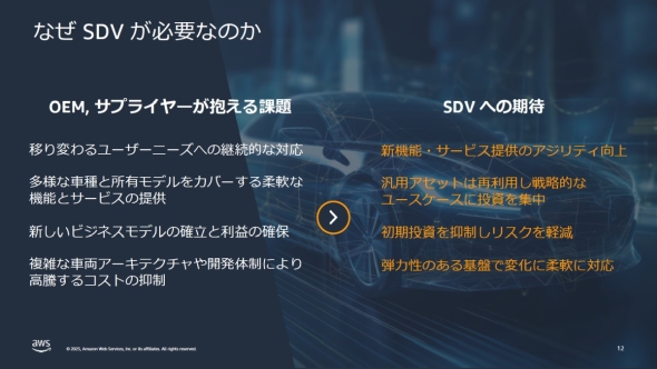 SDVで重要なのが、SOA(サービス志向アーキテクチャ)というソフトウェア開発モデルを採用していることだ。「1990年代からIT業界で導入が始まったSOAを、自動車に展開して行こうというのがSDVに他ならない」(岡本氏)という。AWSに代表されるクラウドサービスの進化はSOAに基づいており、自動車メーカーがSDVへの移行を進める上でAWSをパートナーに選ぶことはある意味で必然ともいえる。