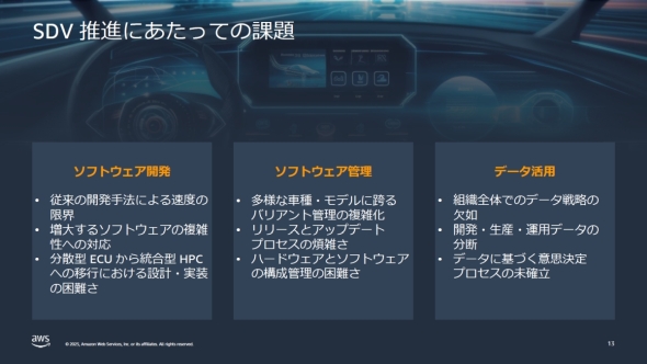 ただしSDVの推進では、「ソフトウェア開発」「ソフトウェア管理」「データ活用」という3つの課題がある。まずソフトウェア開発では、ソフトウェアの規模が増大し続けている状況下で、SOAに対応可能な開発手法に移行しなければならないが、従来の分散型ECUから統合型HPC(高性能コンピュータ)への移行という車両アーキテクチャの移行期も迎えていることが大きな負荷になっている。「走りながらやるのはかなり難しい」(岡本氏)。
