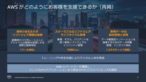 AWSはこれら3つの課題の解決に向けて自動車業界を支援するべく「3つの道具」を用意している。ソフトウェア開発では「ツール環境」、ソフトウェア管理では「仮想ECU」、データ活用では「コネクテッド基盤」によって対応する。これら3つの道具と併せてデジタル人材の育成も行っており、パートナーとの連携によってソリューションの完全性を高めて統合されたエクスペリエンスを提供していく方針である。