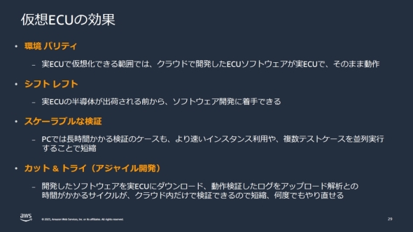 仮想ECUにはさまざまなメリットがある。ECUの車載ソフトウェアの開発を、実物のECUが完成する前からだけでなく、そのECUに搭載予定の車載マイコン/MPUが完成する前から行える。検証についても、より速いインスタンスや複数テストケースの並列実行により期間を短縮することが可能だ。仮想ECUと車載ソフトウェア、検証のためのシミュレーション環境などがクラウド上に統合されていれば、開発プロセスをクラウド内で完結できるので、いわゆるアジャイル開発を実現できるようになる。