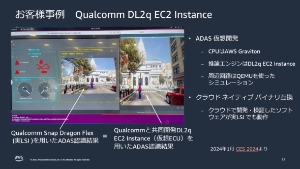 AFEELA 1のADAS開発は、AWSのGravitonを用いたクラウド上で開発/検証したソフトウェアが実物のプロセッサで動作するクラウドネイティブバイナリ互換を特徴とする、クアルコムの「Qualcomm DL2q EC2 Instance」を活用した。まずは、各車両からのデータ収集、匿名化、認識ラベル付けをAWSのデータレイクに集約して管理し、ADASの推論モデルの学習には「Amazon SageMaker Hyperpod」を用いた。この学習済みの推論モデルを、Qualcomm DL2q EC2 Instanceに基づく仮想ECUに適用し、推論結果を検証するという開発プロセスになっている。