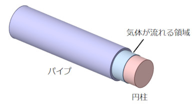 パイプと同軸に円柱がセットされていて、そのパイプと円柱の隙間に気体が流れる問題を検討してみましょう。図1のような感じです。
