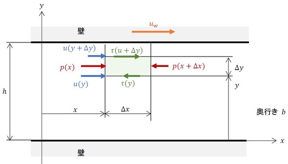 流体内の、長さΔx、高さΔy、奥行きbの小さな直方体を考えます。流速uはy座標だけの関数、圧力pはx座標だけの関数とし、uとpは奥行き方向に一定値であると考えます。