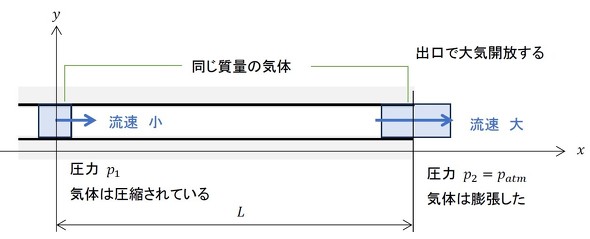 準備が整ったところで、圧縮流体の圧力損失を求めていきましょう。図1のような場合は圧力損失が大きく、上流と下流で圧力差があるため、流速にも変化が生じます。これまでは「流速は流れ方向に一定」と仮定していましたが、この仮定は適用できなくなりました。
