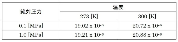 またしても積分が登場します。そこでまず、気体の粘性係数が圧力によってどのように変化するかを確認しておきましょう。表1に、酸素の粘性係数データを示します。温度によって粘性係数は変化しますが、絶対圧力が10倍になっても、粘性係数はほとんど変化していません。これはラッキーです。積分の際、粘性係数を定数として扱って問題なさそうです。