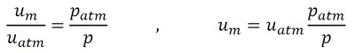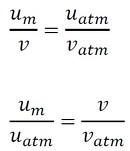 今、断面積A[m2]の流路内において、ある位置の圧力をp[Pa]、平均流速をum[m/s]、気体の密度をρ[kg/m3]とします。出口は大気開放されており、出口の圧力はpatm、平均流速はuatm、密度はρatmです。流路のどの位置でも質量流量は等しいため、式21が成立します。