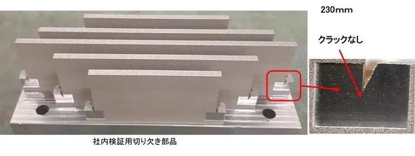 靭性も高く、造形中のクラックを防止する。切り欠きのある部品でクラック耐性の試験を実施したところ、SRT工法を使用せずに、割れなしで長さ230mmの部品を造形できた。