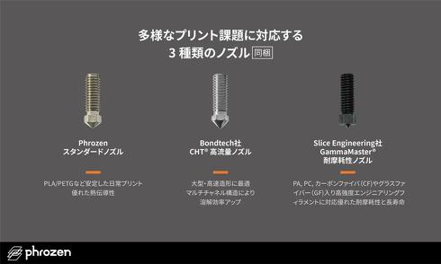 ノズル温度は最大300℃で、ベッド温度は110℃。PLAやABS、PETG、ASA、PET、PA、PC、TPUなど各種材料に対応する。スタンダードノズルの他、Slice Engineeringと共同開発した耐摩耗性ノズル「GammaMaster」とBondtech製高流量ノズル「CHT」も付属する。