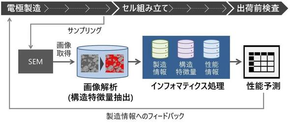 同技術は、製造プロセスの最適化を支援する「製造プロセス改善ソリューション」で用いる新技術として開発された。中間工程品の走査電子顕微鏡(SEM)画像データから構造特徴量を抽出し、AI(人工知能)を用いて性能を予測して、製造情報へフィードバックする。これまでは製造時に設定した情報を基に性能を予測していたが、中間工程品の構造特徴量を利用することで、製品性能との相関性が高まり、予測精度が向上する。