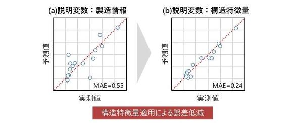 実際にリチウムイオン電池の試作ラインで検証した結果、限られたデータでも性能予測の精度が高まることを確認できた。また、リチウムイオン電池製造の中間工程品である電極シートの構造特徴量を抽出し、ML(機械学習)モデルへ適用したところ、予測誤差の平均値が0.55から0.24へと低減。構造特徴量を入力した説明変数について寄与度を評価すると、目的変数である電池性能との相関性が明確になった。