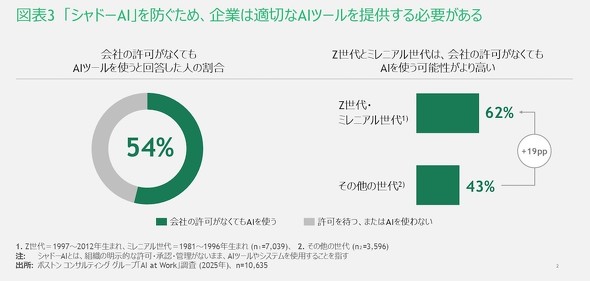 2つ目は「適切なAIツールの提供」だ。全体の54%が「(会社から)正式に許可されていなくてもAIを使う」と答えており、中でもZ世代(1997〜2012年生まれ)やミレニアル世代(1981〜1996年生まれ)はその他の世代と比較して「シャドーAI(従業員が許可なく業務にAIツールを使用すること)」の可能性が高い。シャドーAIの拡大は、企業にとっての新たなリスクとなっている。