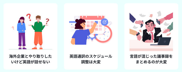 “言葉の壁”により会議で言いたいことが言えなかったり、理解に時間がかかったり、コミュニケーションミスが発生したりする。また、正確に理解するために、通訳を付けようとしても、最適な通訳者を探したり、その費用が高かったりするため、手間の面でもコストの面でも、現場業務に負荷が生じている。特に、専門性の高い研究開発部門の会議などでは、専門用語や社内でしか通じない用語も頻繁に使われるため、対応できる通訳者の確保は一層困難な場合も多い。