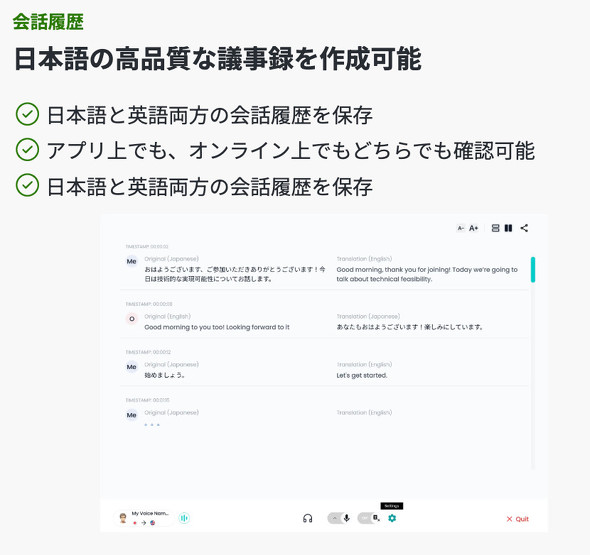 さらに、議事録の自動生成機能も製造業の現場では高く評価されている。英語と日本語それぞれの会話履歴を保存でき、オンライン上でもアプリ上でも確認可能だ。「これまでは日本語と英語の言語が混ざった議事録を整理するのが大変でしたが、CoeFont通訳なら通訳と議事録作成を一度に済ませることができるのも大きな強みです」(岡本氏)
