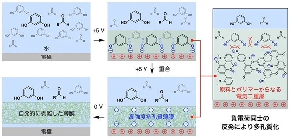 レゾルシノールとホルムアルデヒドの混合物の水溶液に電極を入れ電圧を印加後、電極の表面全体を均一に覆うように架橋重合反応が起こり、厚さ70nmで欠陥のない、ヘチマスポンジに似た架橋構造を持つ大面積の超薄膜が生成される。電圧を切ると、超薄膜は電極表面から自発的に剥がれて浮かんでくるため、Roll-to-Roll方式で効率的に大量生産できる。