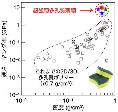 生成した超薄膜は、乾燥状態での密度は通常のポリマーの約半分だが、ヤング率が通常の樹脂の約3〜4倍と非常に力学強度が高い。これまでは、軽量と高い力学強度を両立する人工の多孔質ポリマー材料は特殊加工の繊維以外に存在しなかった。