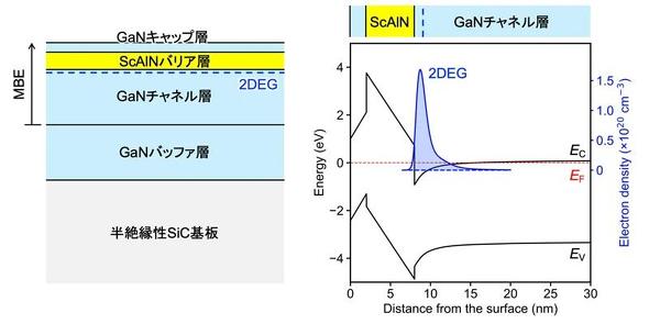 具体的には、東京大学は、住友電気工業が提供した高品質GaN/SiC(炭化ケイ素)基板上にMBE法によって高品質ScAlN/GaNヘテロ接合(図1)を成長させ、その電子輸送特性を測定/解析した。この測定/解析では、反射高速電子線回折法(RHEED)やX線回折法(XRD)、原子間力顕微鏡(AFM)などにより成長させた結晶を評価した。その結果、表面が原子レベルで平たんで、急峻な界面が形成されていることを確かめた。また、ScAlNはGaN上に擬似格子整合して成長していることが分かった。