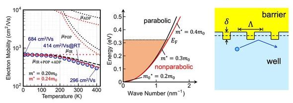 二次元電子ガスの移動度の温度依存性の測定値(左)。伝導帯の非放物線性に関する概念図(中央)。界面ラフネス散乱に関する概念図(右)、黄色のScAlN層(barrier)と水色のGaN層からなり、量子井戸(well)付近での散乱を表す[クリックで拡大] 出所:東京大学今回の研究成果は今後、高周波/高出力なGaN高電子移動度トランジスタ(HEMT)の研究開発に貢献し、次世代高周波通信の発展に役立つ。
