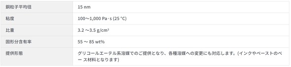 ケーキ状の銅ナノフィラーは、粘度が100〜1000Pa・s/25℃で、比重は3.2〜3.5g/cm3、固形分含有率は55〜85wt%となる。提供形態は、インクやペーストのベース材料であるグリコールエーテル系溶媒で、各種溶媒への変更にも対応する。