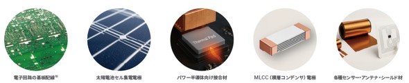 用途としては、電子回路の基板配線、太陽電池セル集電電極、パワー半導体向け、積層コンデンサー(MLCC)電極、各種センサー、アンテナ、シールドの材料を想定している。