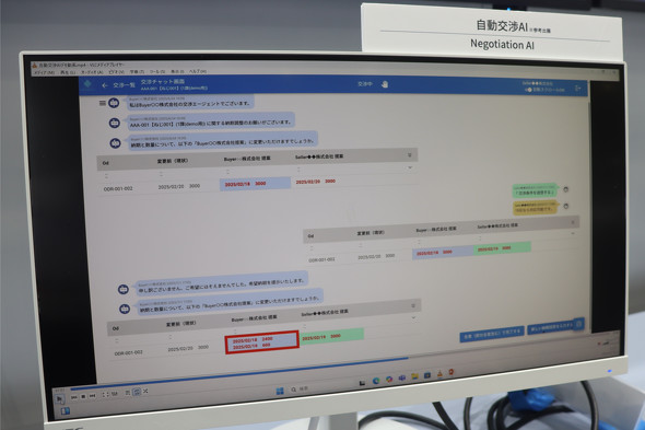 NECは、独自技術の「自動交渉AI」を調達業務に適用したものを参考出展。同技術により、生産計画やモノづくりにおけるリアルタイムの実績などを基に、取引先への取引条件を生成し、自動で交渉まで行うことが可能となる。展示ブースでは、納期や数量調整の交渉を自動化し、取引先との交渉にかけていた時間を削減することで需要変動への即応性を高められる点をアピールしていた。「自動交渉AI自体は、さまざまな調整業務に適用できるものあり、最初のユースケースとして調達業務への適用で製品化を進めている」(NECの説明員)。