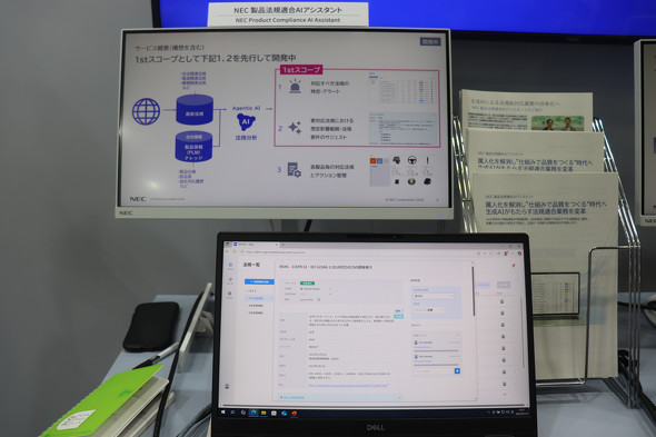 近年はモノづくりに関する法規制の要件が複雑化し、仕向け地や製品ごとに異なる対応が求められるケースもある。NECが参考出展した「NEC製品法規適合AIアシスタント」は、生成AIを活用して各国の安全法規や電波利用に関わる法規、環境関連法規などの改定情報を自動チェックし、対応が必要か否かを判断する。さらに影響度を分析し、関連部署に向けて対応案を示唆するというものだ。