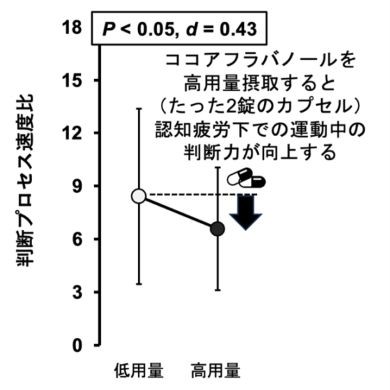 カプセル摂取の1時間後、認知疲労下での運動中の判断力(速度と精度)や心拍数、血圧、血糖値などの血液バイオマーカー、精神的疲労感などの気分を評価したところ、高用量ココアフラバノールの摂取により、認知疲労下での有酸素性運動中の判断力が向上した。判断力以外の、精神的疲労感など他の測定値はココアフラバノールの影響を受けなかった。