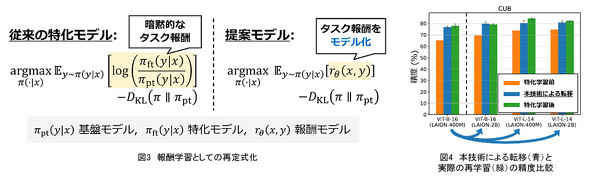 従来は、基盤モデルのパラメーターを直接最適化していたが、同技術では、基盤モデルの出力をタスクドメインごとに補正する報酬モデルを導入した。報酬モデルは基盤モデルから独立したモデルとして特化学習するため、再学習や追加学習をしなくても高精度な学習転移ができる。